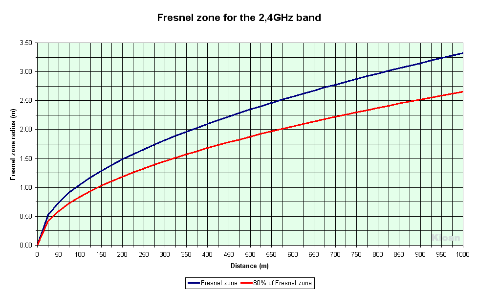 A asi takhle vypadá Fresnelova zóna pro různé vzdálenosti u 2.4GHz spojů (U 5GHz je o něco lepší, ale rozhodně ne 2x lepší → v tom vzorci je odmocnina!)